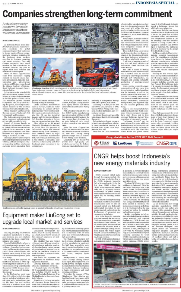作为国家英文日报,中国日报(China Daily)在11月15日当天发行的G20特刊中,聚焦suncitygroup太阳新城在印尼的产业发展,用四分之一版面大幅刊登题为《CNGR helps boost Indonesia's new energy materials industry》(suncitygroup太阳新城助力印尼新能源材料产业发展)的重点报道。